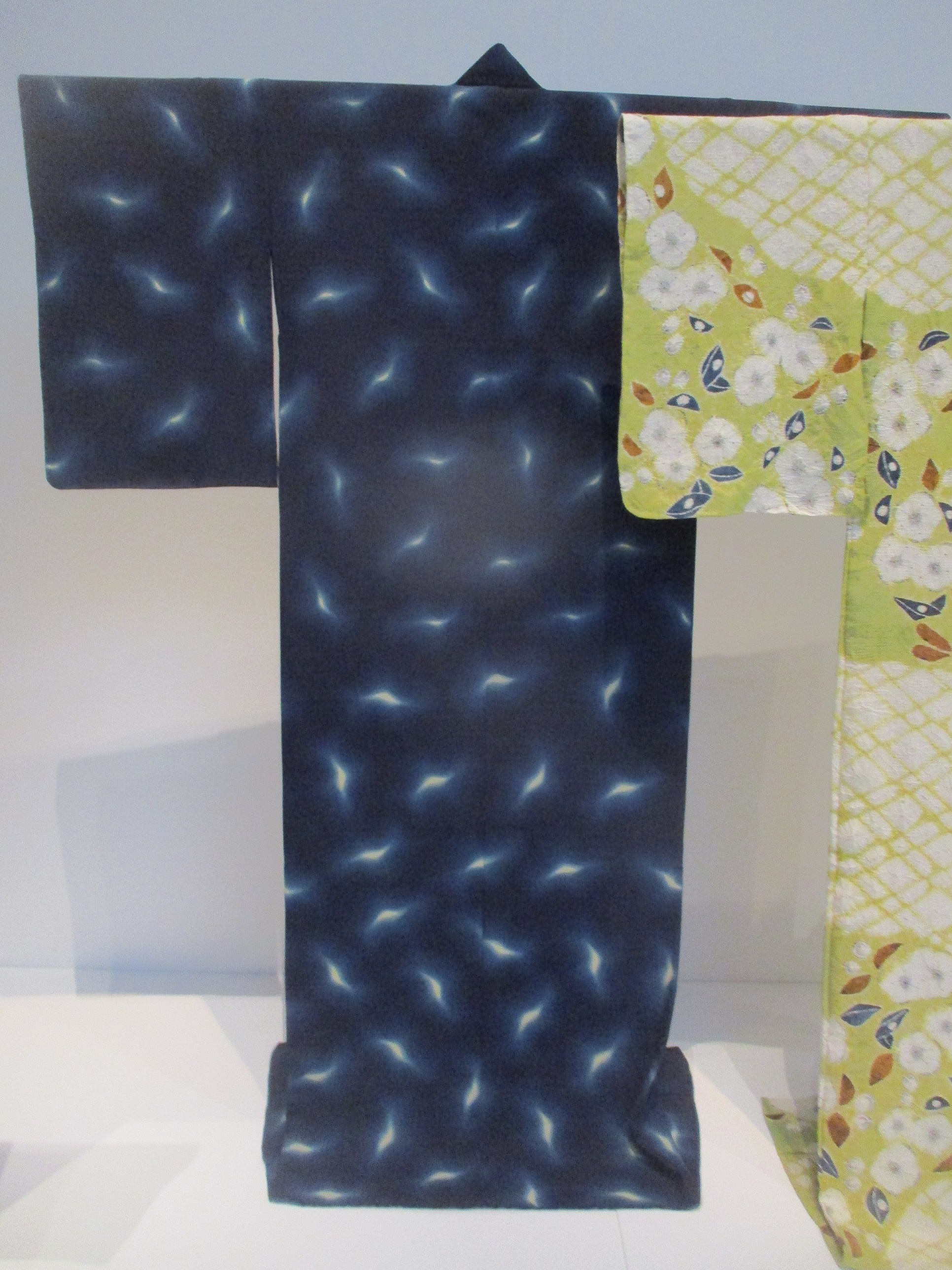 This small mirrored section of the exhibition displays how kimono are basically a blank canvas for designers to express themselves through politics, social comment or sexually. The seemingly infinite variety of representational or abstract patterned designs which have been used to adorn the kimono are on show here. Many weren't just decorative, but celebrated the arrival of certain technologies such as flight, with the depiction of aeroplanes, and also communication with a telegraph pole design. Others had fabrics printed with important global events on them such as sporting events in the Olympic Games.
