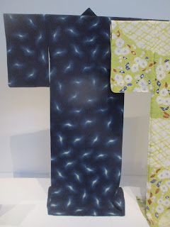 The last room of the exhibition is again beautifully presented with the initial section focusing on traditional embroidery techniques, and bold, graphic, printed pattern in modern and contemporary kimono. The exhibition then goes on in the end section to illustrate how contemporary fashion designers have appropriated kimono design for couture fashion, and film and music performances. The kimono aren't presented behind glass in this section so you get better chances to examine them without the distracting reflection from the glass presentation cases. I doubt I will see a better designed and presented exhibition again for the rest of the year.