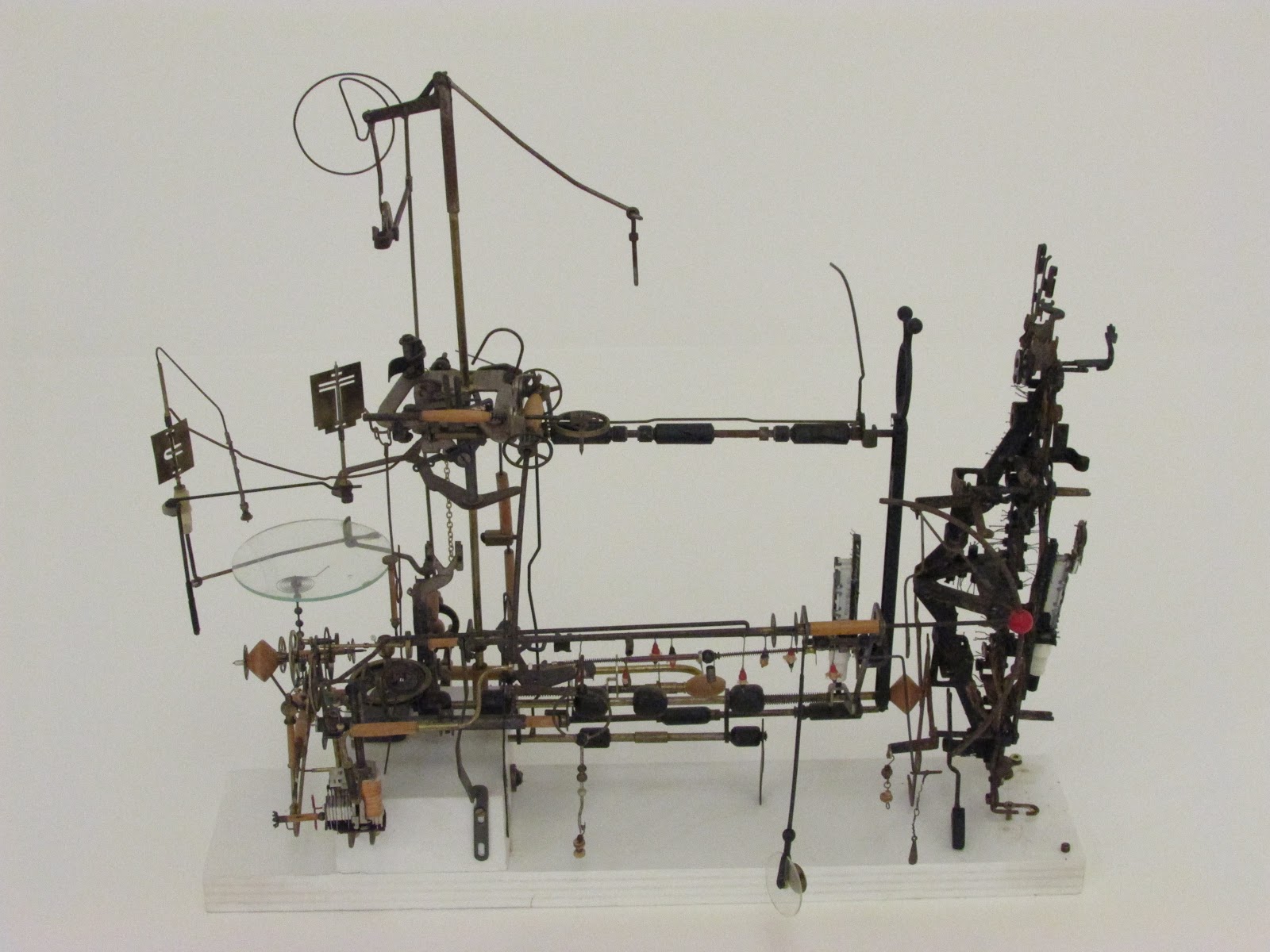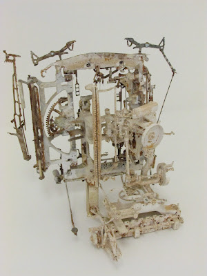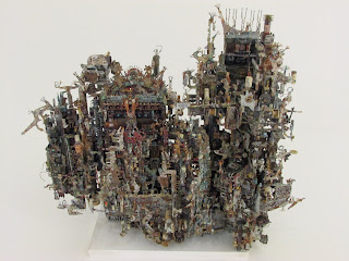 These small scale sculptures titled "Machines" by the outsider artist who goes under pseudonym A.C.M. were amazing. The artists name is Alfred Marié, and the "C" in his pseudonym represents his long-term partner Corinne, who was initially the biggest supporter of his work. These sculptures are created from the barest bones of the inner workings of defunct components of alarm clocks, typewriters, and transistor radios, which he corrodes with acid, lets rust, and then carefully crafts to create individual structures, like scaled down futuristic architectural models. They were one of my two favourite discoveries in LaM's Art Brut collection.