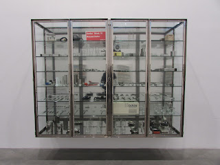 This survey of Damien Hirst's early works from his own archive proved to be really fascinating. His earliest works, found-object collages owing a debt to Schwitters, are a real revelation which gives clues as to how his oeuvre would develop. This exhibition (seen between lockdowns), is like a greatest hits show that charts the developments of the themes and ideas that would lead him to being the most successful British artists of his generation. Surprisingly most of the works here failed to sell at early exhibitions of his work, and are not for sale here either. There is much death here. The spectre of the Grim Reaper pervades nearly all works whether it be the carcasses of animals (sure to enrage animal rights activists), the notorious picture of Hirst with the severed head of a corpse in a mortuary, or death implied, in the endless vitrines of life-sustaining pills and medicines. Much of this early work retains its shock value. The freezer full of severed, skinned cows' heads seems both gruesome and gratuitous, A Hundred Years, situated at the end of the exhibition, is the masterpiece in which maggots hatch then feast on a decapitated cow's head only to die as flies littering the floor of the vitrines' chambers having flown into an Insect-o-cutor suspended above. A Hundred Years holds a macabre fascination which haunts the viewer long after they have left the exhibition. Although Hirst is not really a painter in the grand tradition of art and his hero Francis Bacon, the presence of the early Butterfly, Spin and Spot paintings, is really welcome, and provides a much needed addition of the human touch, and injection of colour in this exhibition. They alleviate the presence of the numerous cold, sterile, clinical vitrines of medical equipment. In a year that has seen the COVID-19 virus claim countless lives worldwide though, certain Hirst vitrine works here seem prescient. Waster, created in 1997, another large vitrine full of what looks like used PPE and disposable medical equipment, certainly with the luxury of hindsight, seems to comment on the crisis of this years' pandemic, the importance of the role of key workers in the NHS, and their battle with the government to get vital PPE to enable them to successfully protect themselves from the virus and do their jobs. Like or loathe Hirst and his art this is a really important exhibition. He has played the art world at its own game, creating a mythology around both himself and his work, iconic commodities that collectors and the art market adore.