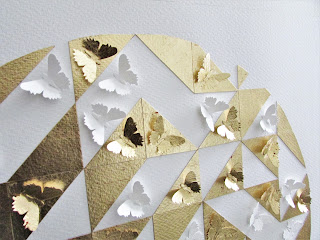 Collating all of the above information I began to develop my own dazzle designs. I have enjoyed working with grids previously with my Struktur series (here), but in these new Dazzle pieces I began devising square and circular grids from geometric shapes that were used to create decorative but disruptive patterns rather than harmonious ones. I played with triangular shapes cut from sheets of papers that I had applied gold leaf to by hand. Each Dazzle artwork features a random configuration of the triangular patterns and is therefore a unique artwork in itself. Once I was happy with the structure of the gold patterned base I began to add my signature hand-cut butterfly silhouettes. I chose to use the silhouette of the versatile little Hackberry Emperor butterfly which I've employed for its usefulness in creating pattern before. The colour and texture of these butterflies had of course to resemble the white and gold grounds so I have used the same papers, seemlessly blending white on white and gold on gold for the cryptic camouflage of the butterflies to be most effective. Interestingly under different light conditions throughout the day the placement of the various butterflies in these Dazzle artworks make them seem to disappear into their respective backgrounds or reappear, reflecting the light to betray their presence to would-be predators, making their camouflage qualities highly effective. Dazzle is available to commission in both square or circular formats. Contact me directly via Instagram DM or The Rowley Gallery (here) for availability or further details regarding the Dazzle series.