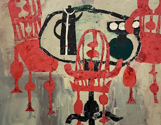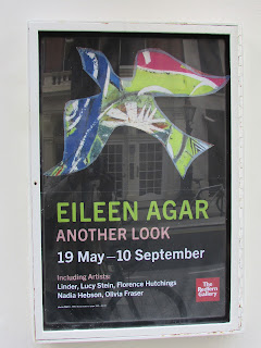 I didn't get to see Eileen Agar: Angel of Anarchy the recent large retrospective at the Whitechapel gallery sadly, but was fortunate enough to be able to make it to this exhibition at the Redfern Gallery celebrating the art of Agar and featuring five invited contemporary artists. The work and spirit of Agar presides over this show like a high priestess whose acolytes pay due homage to her through their own work. Known for early associations with the Surrealist movement, this exhibition displays some fine examples of Agar's work ranging from her abstract paintings to her densely layered collages. The paintings demonstrated make you realise just what a fine colourist Agar was featuring a palette dominated here by a variety of cool blues and greens punctuated by contrasting hot oranges and pinks. I was also very impressed with how proficient Agar was with her collage technique, cutting and pastingg to create richly layered inventive compositions. Just across Cork Street is Waddington Custot currently hosting their Peter Blake: Time Traveller, an excellent exhibition of Blake's collages (here). Blake uses collage to tell imaginative, fantastic stories featuring famous figures. Agar uses the collage technique to exploit surface texture and pattern in her work, employing an array of materials to dazzling effect. Of the other associated artists invited to participate in this show it is perhaps Linder (famed for her 1977 Buzzcocks Orgasm Addict single artwork), with her surreal collages who works most closely in the spirit of Agar. They look as though they could have been created back in the 1920s at the height of the Surrealism movement. I wasn't aware of the paintings of Florence Hutchings previously, but loved these collaged paintings of tables and chairs which also looked as though they were conjured from an early period in art history evoking the Cubist works of Picasso, Braque and Gris. The last artist on show here whose work caught my eye was Olivia Fraser with her paintings which were more obviously influenced and derived from Eastern religions, but again still have the sense of the esoteric and mysticismwhich could similarly be attributed to the work of Agar. this is a really intriguing exhibition and the curators have done a good job with the premise of the exhibition and selection of artists and artworks.
